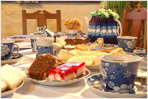 Una tetera con la tradicional cubierta de lana tejida a mano para que la infusión no se enfriara, esponjosos bizcochuelos, pequeños panes, dulces de frutas rojas, tarta de peras, budines de chocolate y nuez, etc. desbordaban la bandeja que la moza traía con firmeza.