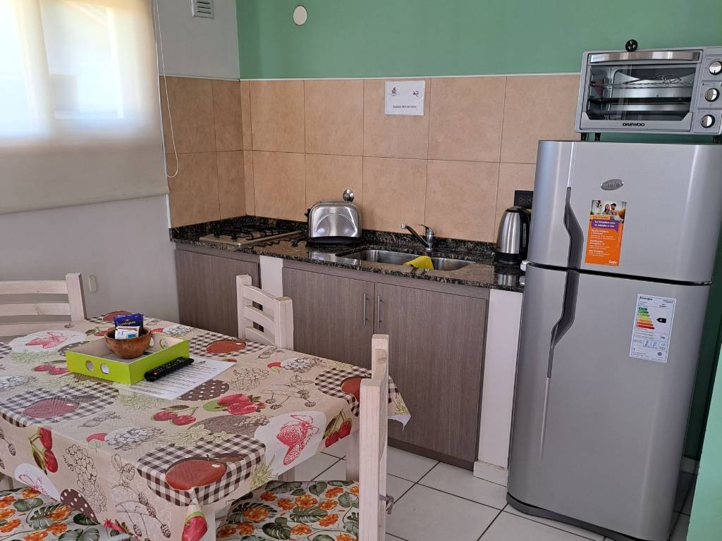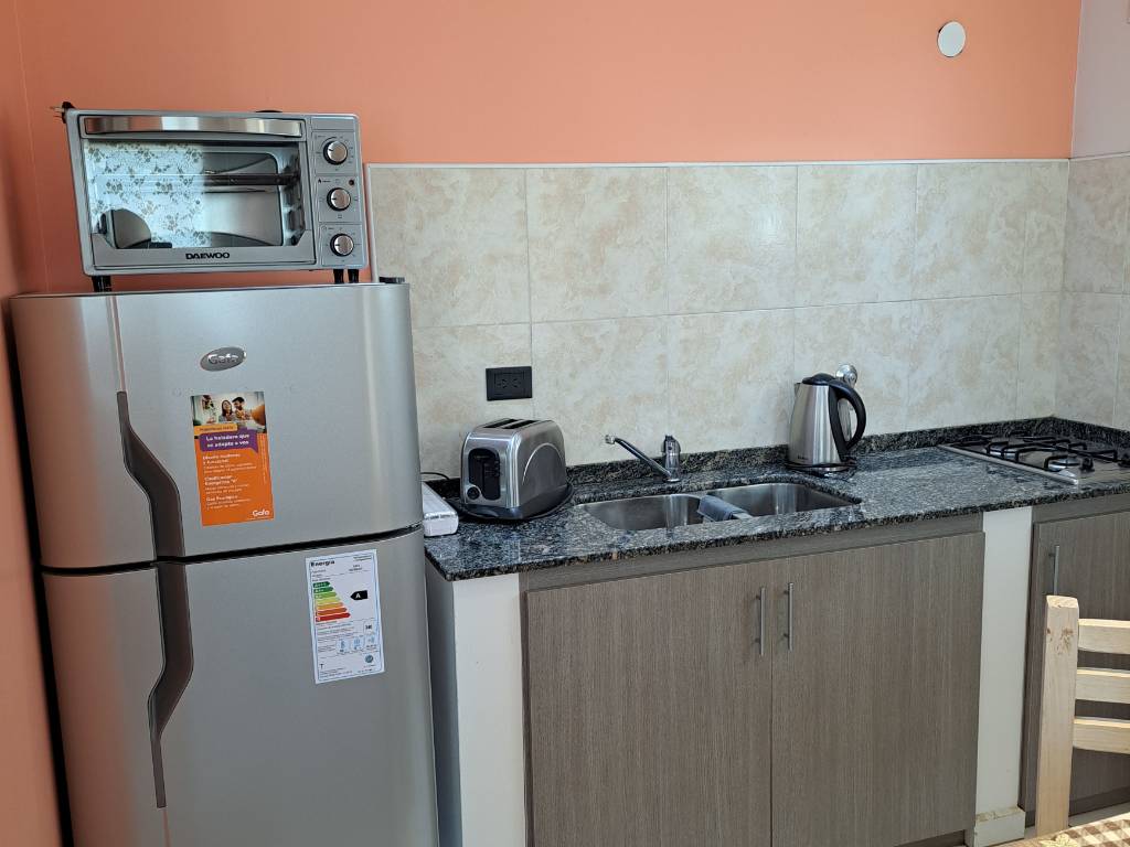 Cada departamento, con capacidad para 4 o 5 personas, cuenta con una cocina completamente equipada, ideal para preparar comidas caseras. El living, amueblado con un sofá cama, invita al descanso y la relajación, mientras que el dormitorio principal ofrece una cama matrimonial y una cama individual, con la opción de agregar una practicuna para acomodar a más huéspedes.