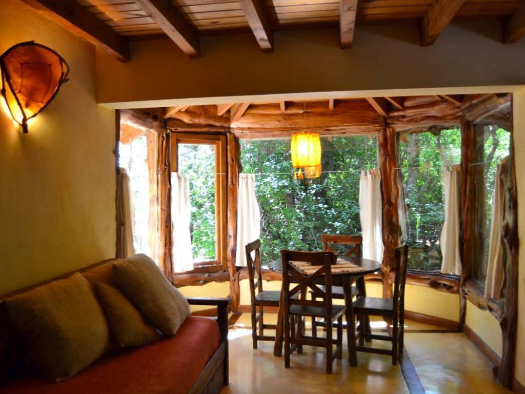 Las cabañas, de estilo rústico y cálido, se integran armoniosamente al paisaje. Construidas en madera y piedra, con amplios ventanales que permiten contemplar las vistas panorámicas del lago Nahuel Huapi y las montañas, ofrecen un espacio de relax y confort.