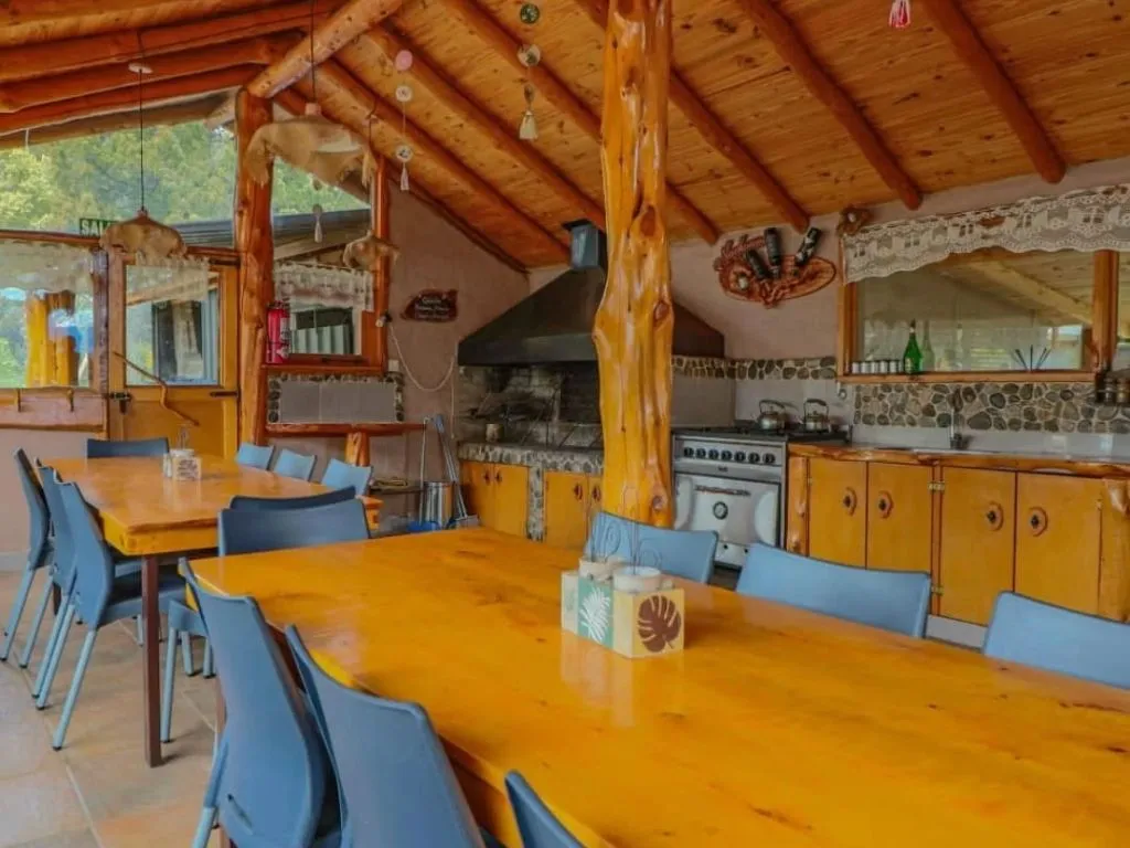 The complex features comfortable bungalows designed for year-round stays. Each unit is furnished with handcrafted rustic furniture and large windows that frame the surrounding landscape, creating a functional and welcoming environment suitable for couples, families and groups.