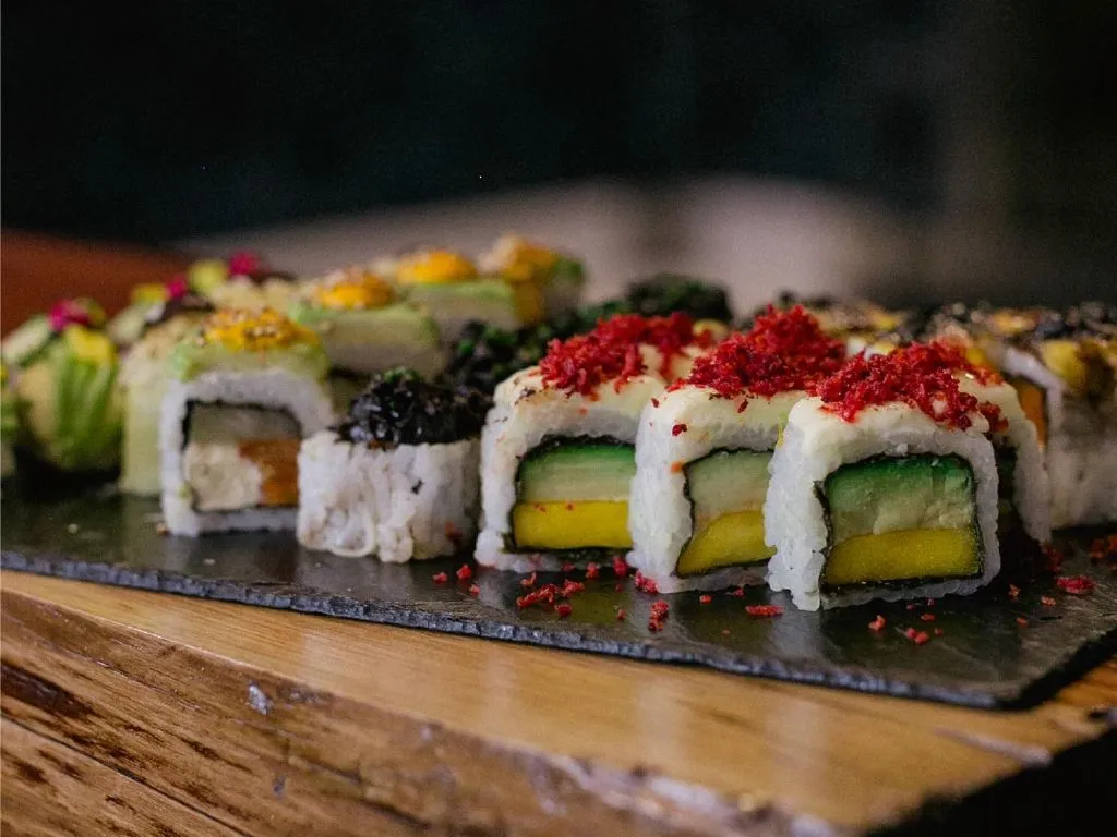 • Sushi in various presentations and combinations.