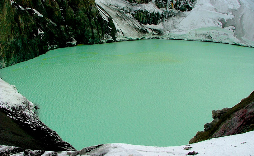 He also made reference to the physiognomy of the site before the 2002 eruption. “In the past, people would rappel down to the pond and bathe in its waters. The ashes covered up that access.” We took a few minutes to behold the inner glacier and the basalt walls inside the volcano conduit, where a pond of thick green liquid gave off the sulfurous smell.