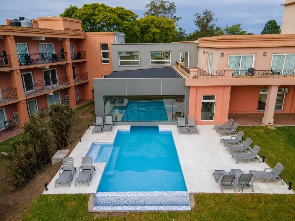• Suite: 36 m², con vista frontal o lateral a la laguna de Chascomús, camas Queen o King, puerta ventana balcón corrediza, split frío/calor, TV 40", frigobar, baño completo con bañera, secador de pelo y amenities premium.