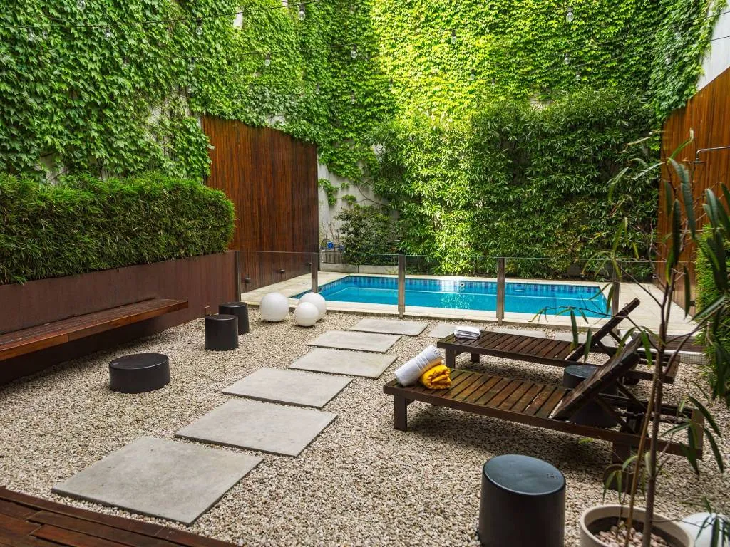 Habitaciones privadas y compartidas. Cocina comunitaria, patio, piscina, desayuno, bar.