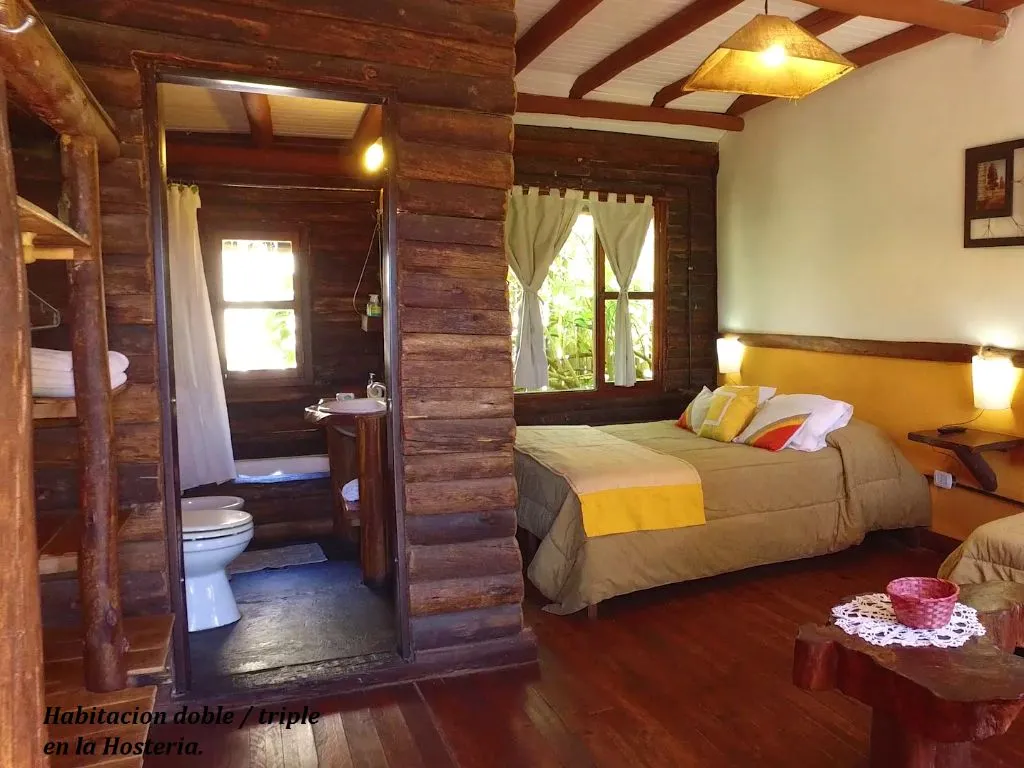 La casa de campo, por su parte, ofrece una experiencia más amplia, con las mismas comodidades que los bungalows, sumando un horno de barro, ideal para comidas al aire libre. La hostería artesanal construida íntegramente en troncos cuenta con habitaciones dobles, triples y cuádruples, todas con amplias vistas al parque, lo que la convierte en una opción muy acogedora y original.