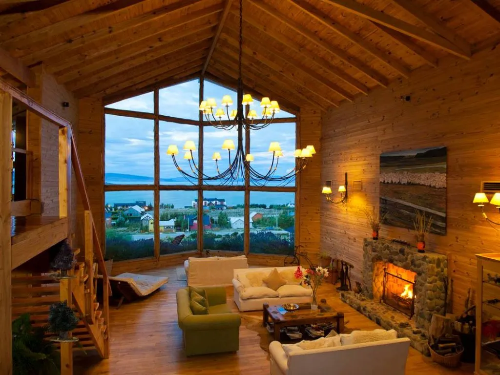 The boutique hotel rooms are decorated in a classic style, all featuring en-suite bathrooms with Jacuzzi tubs and lake views. The cabins, ideal for familiessmall groups, include a living area and a fully equipped kitchen for guests who prefer greater independence during their stay in El Calafate.