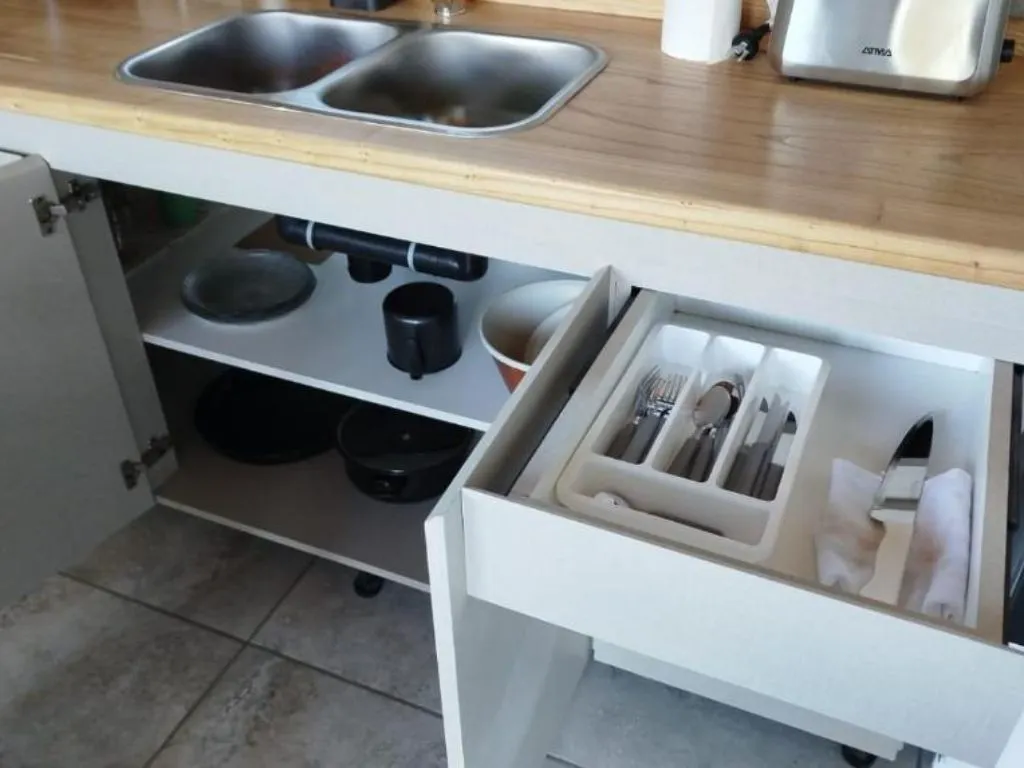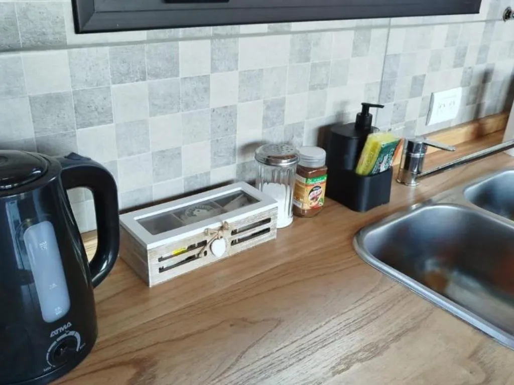 • Fully equipped kitchen-dining area with oven, stovetop, refrigerator, utensils, and electric kettle