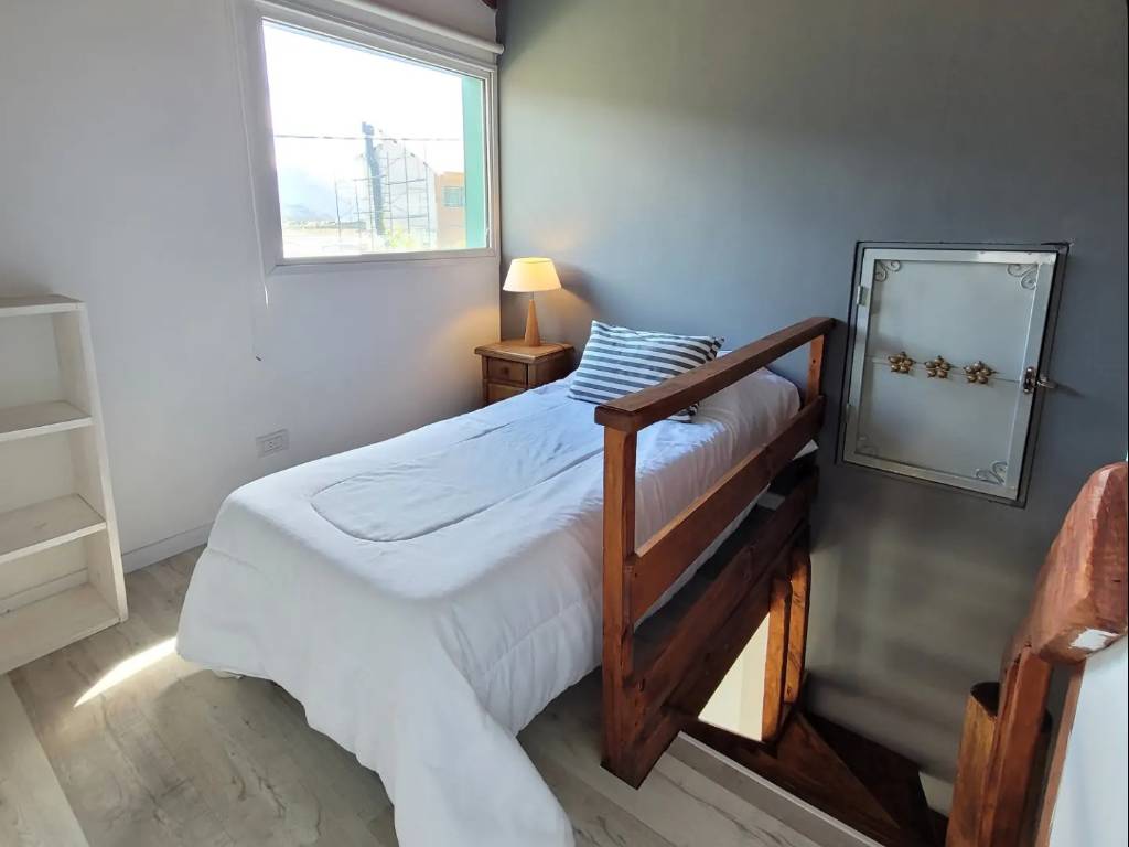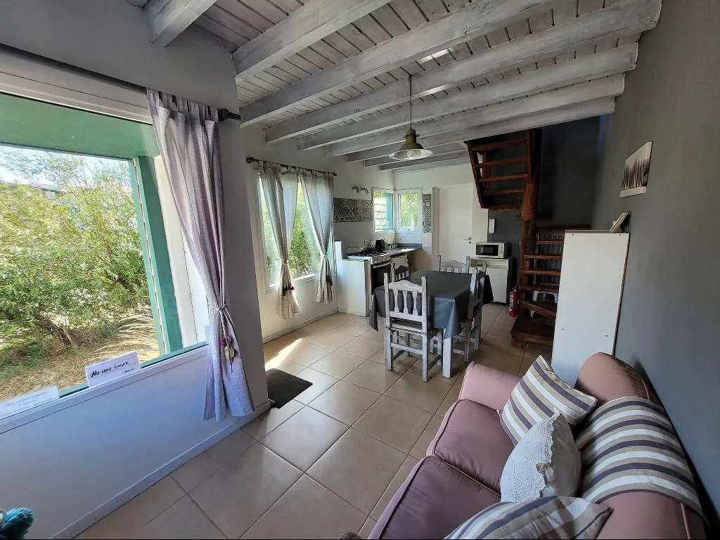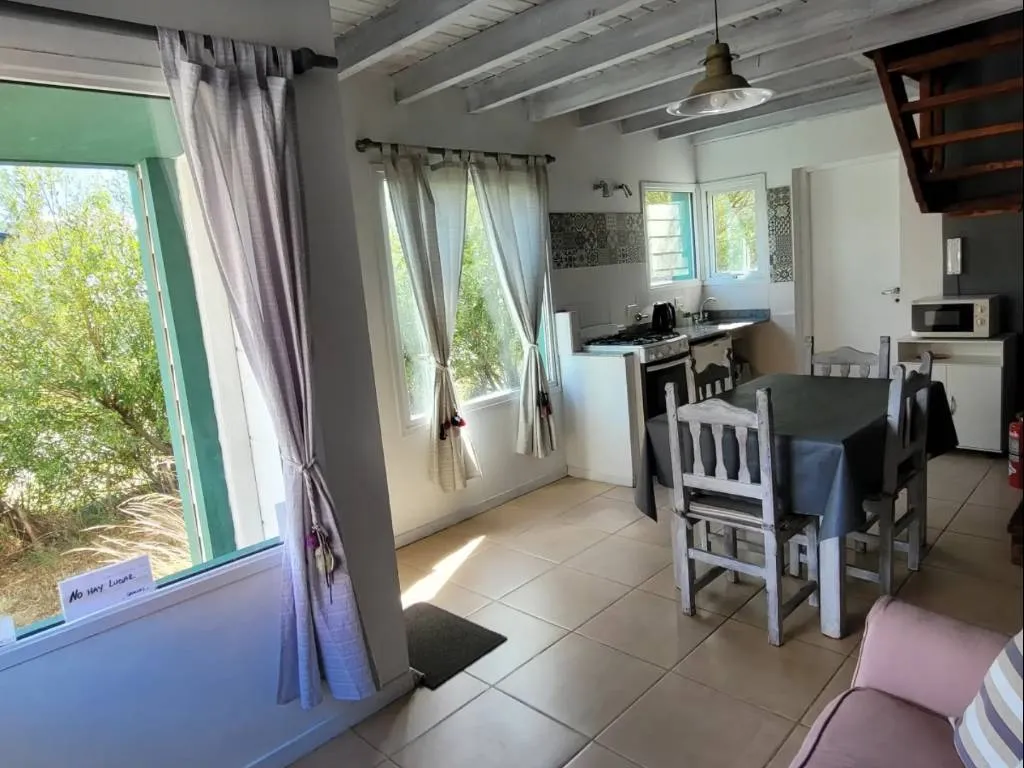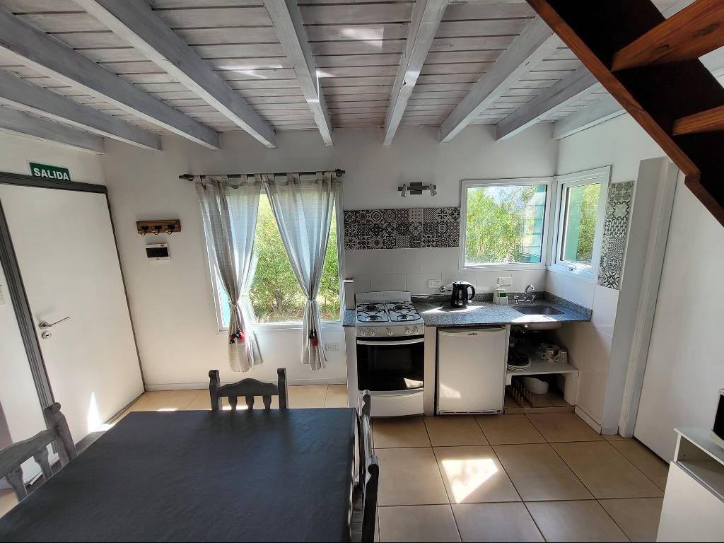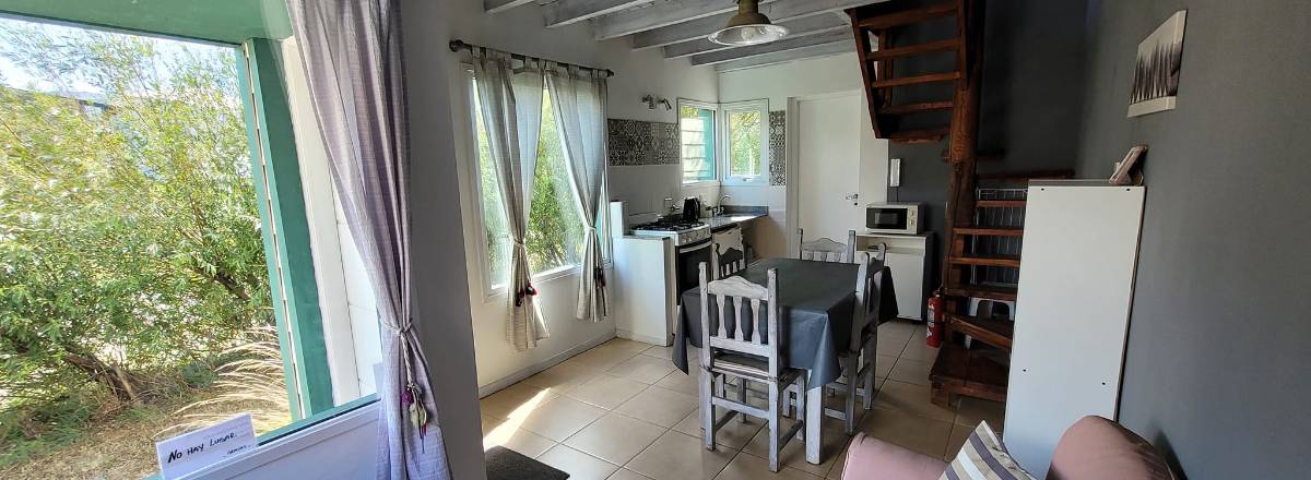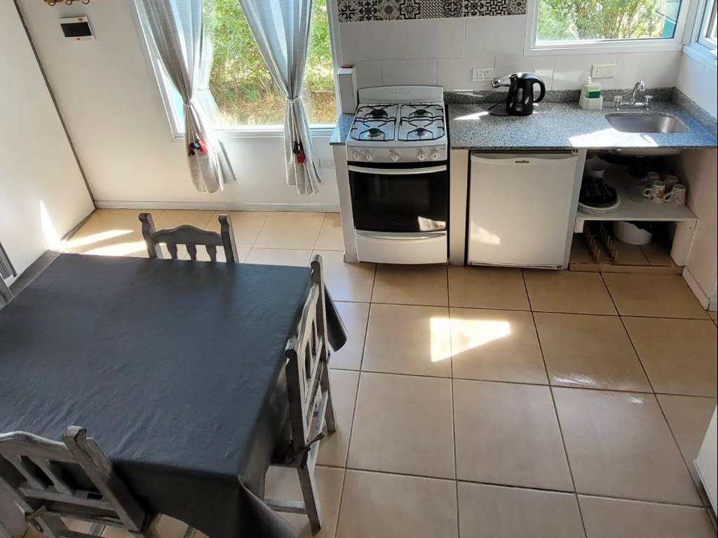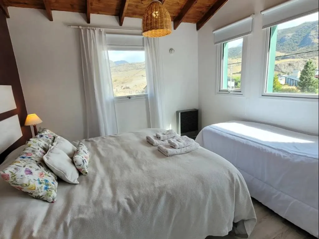Cabañas totalmente equipadas en El Chaltén, cuenta con cocina completa con heladera bajo mesada, microondas, habitaciones con ventanales con vista a las montañas, baño completo, entre otras comodidades.