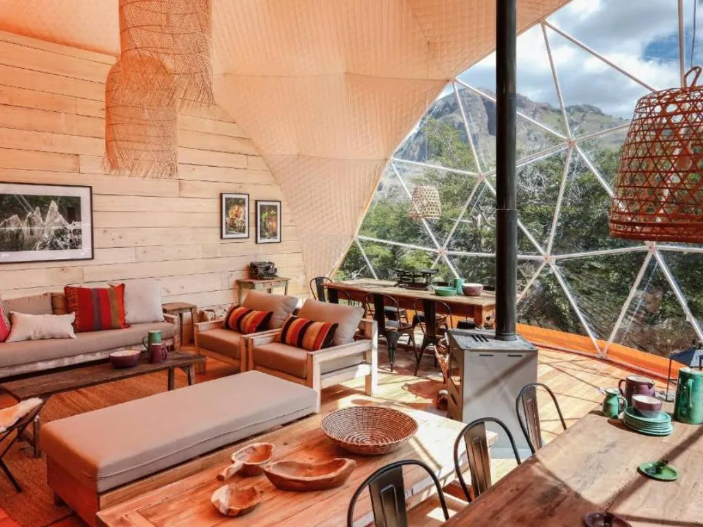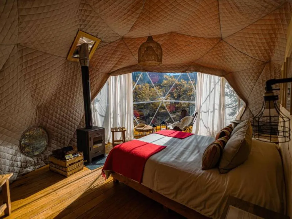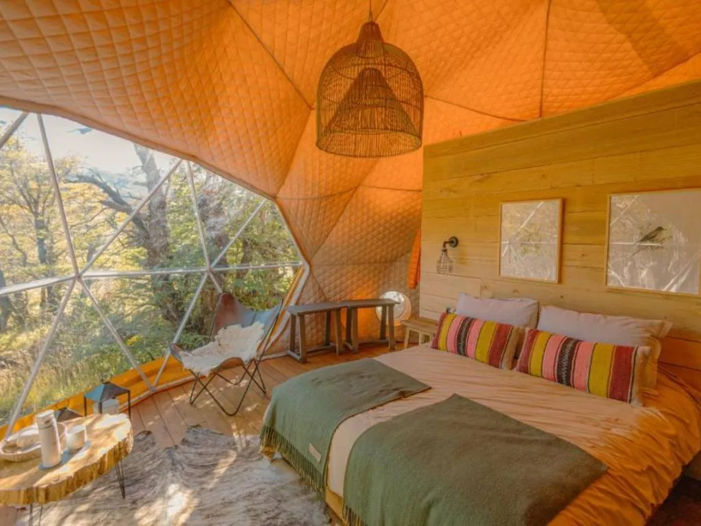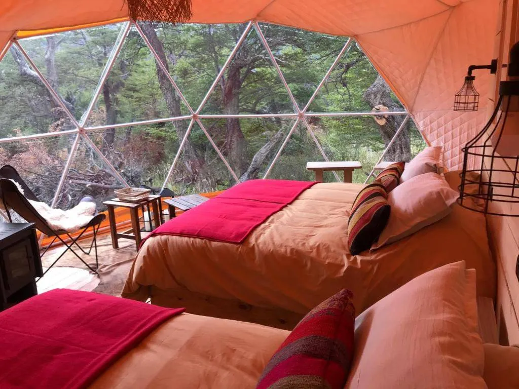 Chalten Camp combina el confort con un profundo respeto por el entorno. Sus domos geodésicos están construidos sobre pilotes de madera, inmersos en el bosque nativo, con un diseño que privilegia tanto la sostenibilidad como la calidez. Cada uno cuenta con baño privado, electricidad de 220v, estufa a leña y camas dobles con mantas abrigadas, brindando una atmósfera acogedora frente al clima patagónico. Con solo 12 unidades disponibles, el refugio es íntimo y permite una desconexión total.