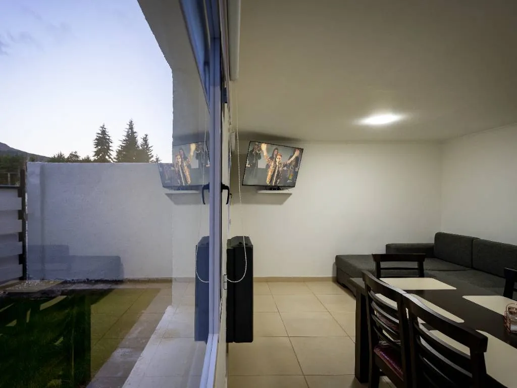 Among the highlighted amenities are a 50” Smart TV in the living room with access to streaming services Netflix, WiFi connection, a bedroom with a double bed and a 42” Smart TV, and another room with a bunk bed and a single bed with an extra pull-out bed. Additional amenities include a sofa, family-size refrigerator with freezer, microwave, kitchen utensils, electric kettle, toaster, coffee maker, closets, and a clothes drying rack.