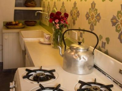 La casa presenta una decoración elegante y dispone de un amplio patio, zona de estar al aire libre y 2 dormitorios confortables. También incluye baño completo y cocina totalmente equipada con horno, microondas, heladera y cafetera.