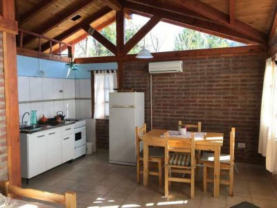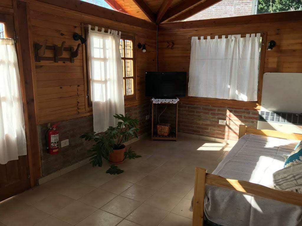 La cabaña para 3 huéspedes cuenta con una habitación con cama doble, un living comedor con sillón-cama simple, una cocina totalmente equipada, TV por cable, un parque con árboles y sol, y una parrilla. La cabaña está ubicada en un ambiente tranquilo y natural, a solo 4 cuadras del centro y a 6 de la plaza principal.