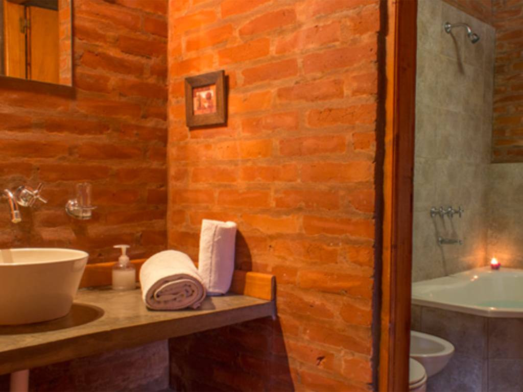 Para familias o grupos más grandes, las cabañas para 4 a 5 personas están disponibles tanto en una como en dos plantas. Incluyen un segundo dormitorio con cama individual y marinera, además de un baño tricompartimentado o compartimentado, y un estar con techo vidriado que aporta luminosidad natural y una conexión especial con el entorno.