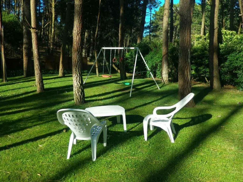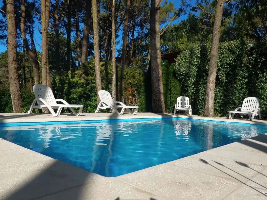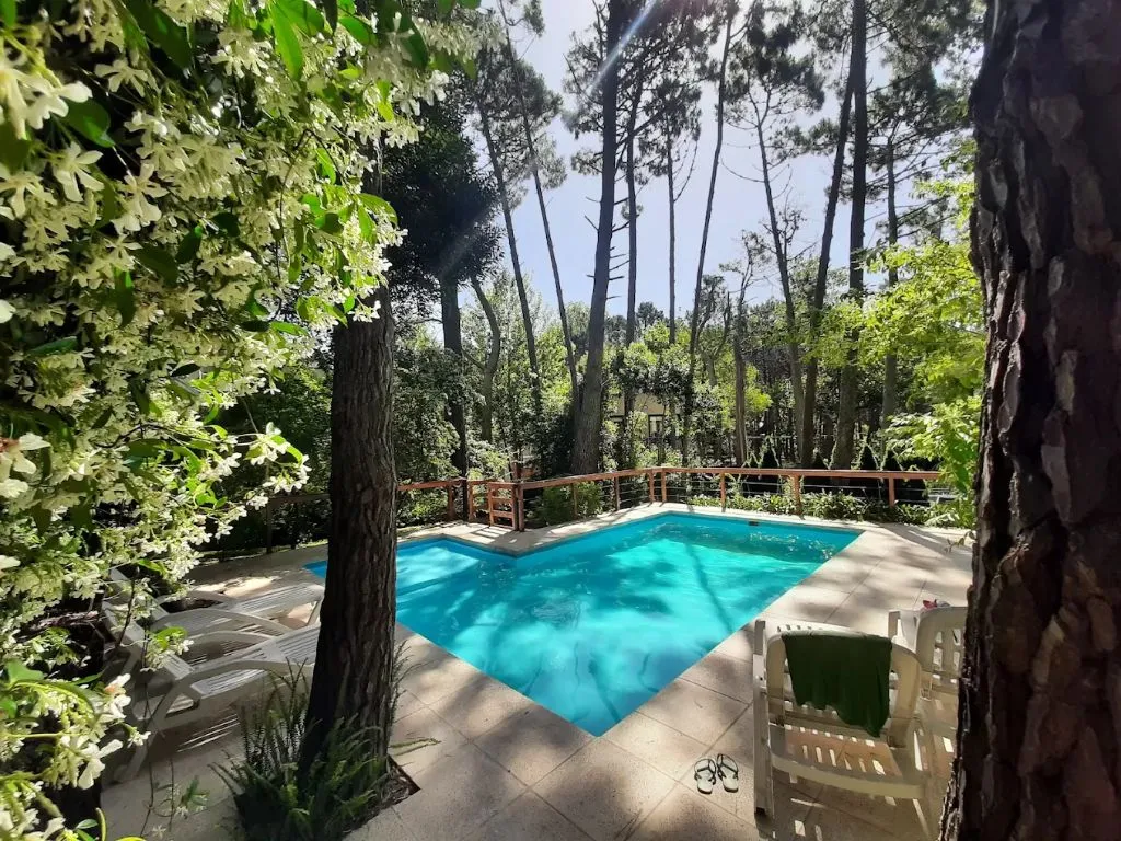 Un punto muy valorado por los huéspedes es la piscina exterior, ubicada estratégicamente entre los árboles del bosque, que ofrece un entorno relajante para toda la familia. Mientras los niños disfrutan de los juegos en el parque, los adultos pueden descansar en reposeras y sillones distribuidos en el jardín.