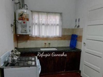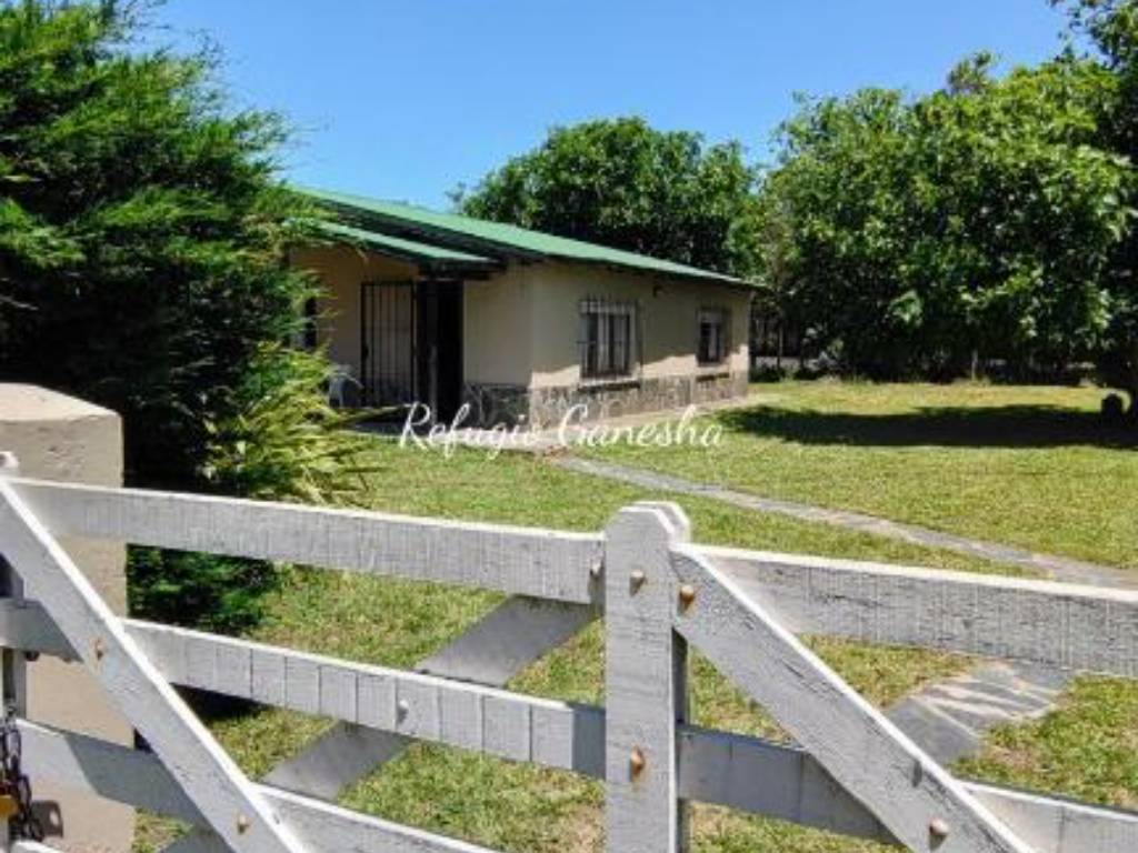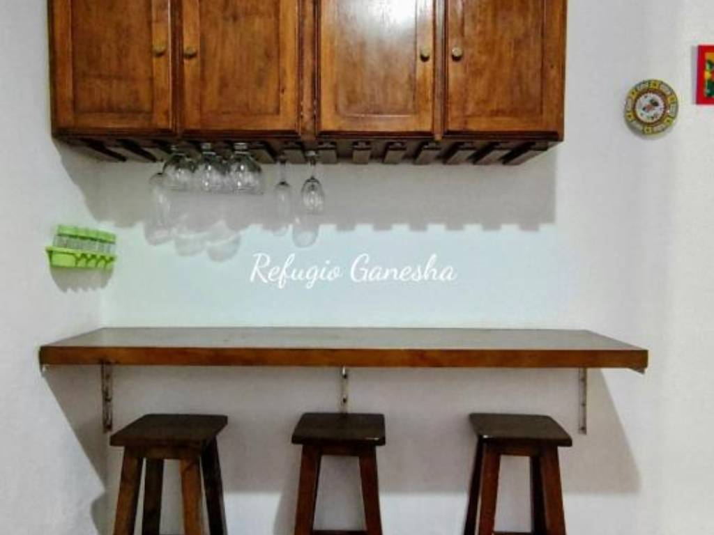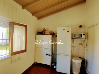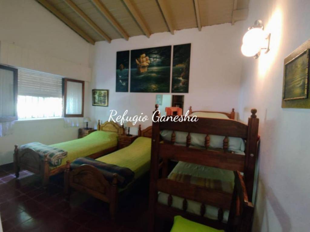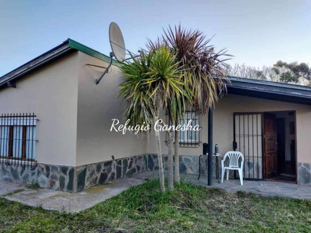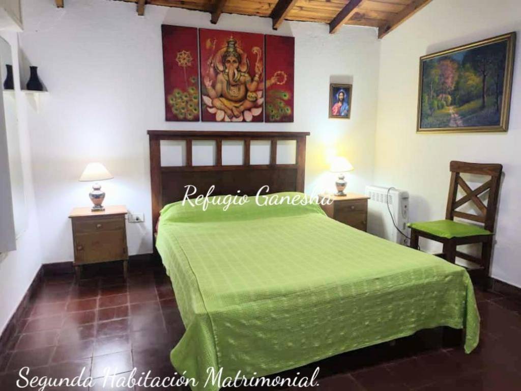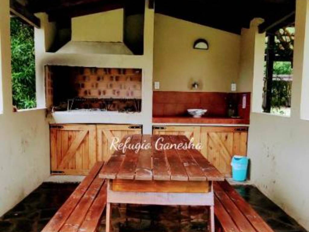 Refugio Ganesha, offers accommodation with all the necessary amenities for a pleasant stay, has Smart TV 55, full kitchen, breakfast area, covered barbecue area with large barbecue, guests can use the entire property, has security cameras, WiFi, clothing white and bed.