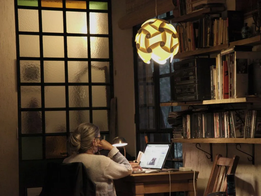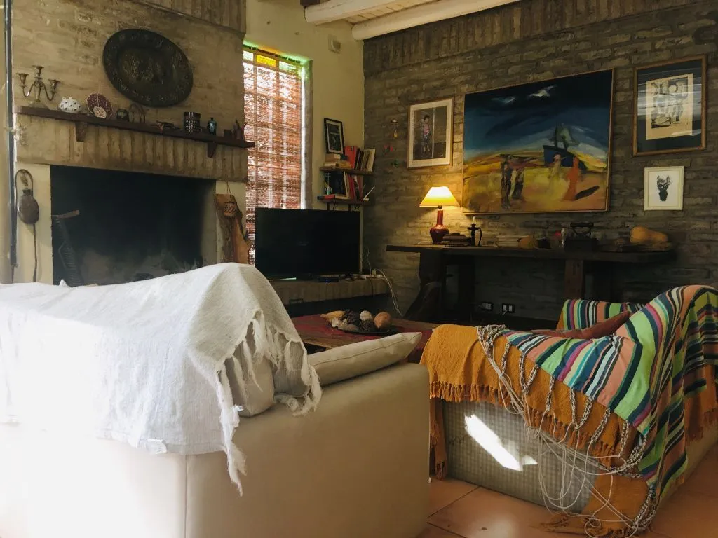 Inside, the house features a spacious loft that integrates the kitchen, dining area, and a cozy living room with a wood-burning fireplace, creating a warm and inviting atmosphere. The kitchen is fully equipped with a microwave, electric kettle, refrigerator with freezer, and all the necessary utensils. The space is bright and comfortable, with a Smart TV with satellite service, WiFi, books, movies, and original artwork that adds a touch of personality. A desk by a large window overlooking the garden provides a perfect corner for readingworking.