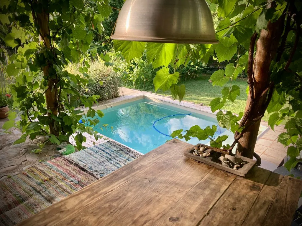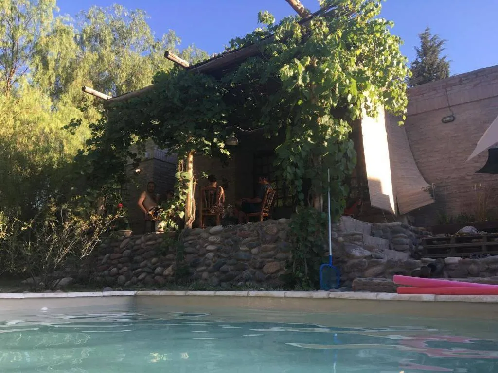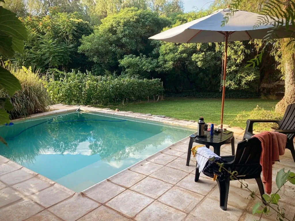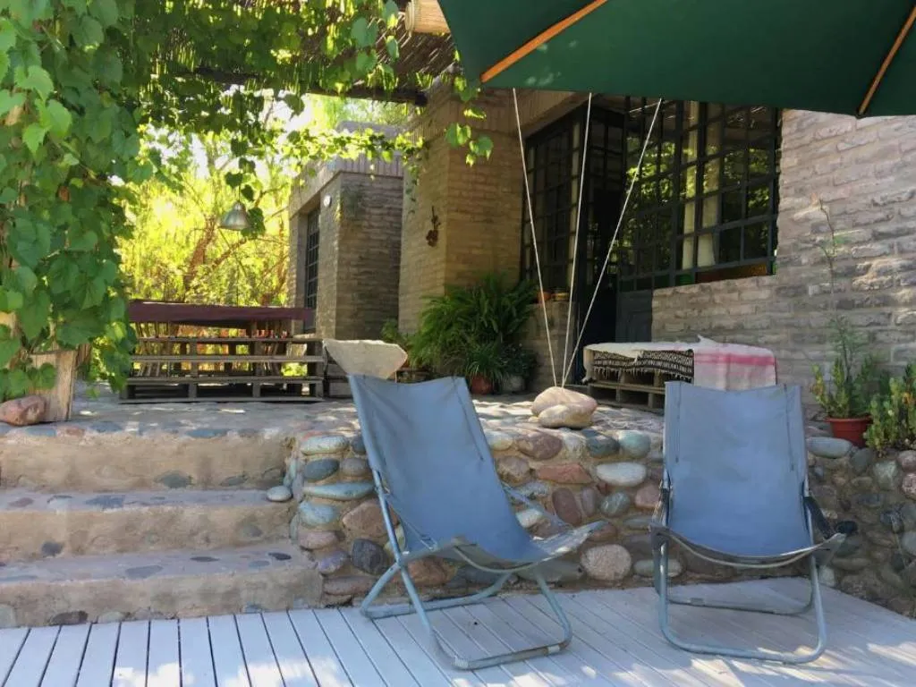 Outside, Las Pircas Casa de Campo is surrounded by a 1,200 m² park bordered by a small Malbec vineyard used to produce homemade wine. It offers a private pool with hydrojet, solarium with umbrellas and lounge chairs, and two terraces: one at the front with a rustic table and benches overlooking the pool and garden, and another at the back with a fire pit, barbecue grill, and clay oven for outdoor dining.