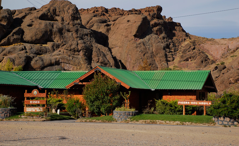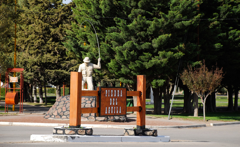 A la distancia, distinguimos dos esculturas: la primera está enclavada en lo alto de una roca: es un águila mora con sus alas extendidas y preside la vida del pueblo desde que se conmemorara los 100 años de la localidad; más allá, el monumento al pescador brinda homenaje a la tan apreciada pesca con mosca de truchas marrones y arco iris en el fecundo río Limay.