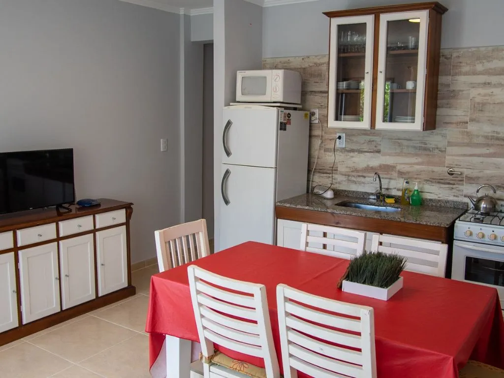 • Azurea Tipo 1: cocina integrada al living con sillón cama con carro, habitación matrimonial con TV y aire acondicionado, segundo dormitorio con cama superpuesta. Capacidad para 4 a 6 personas.