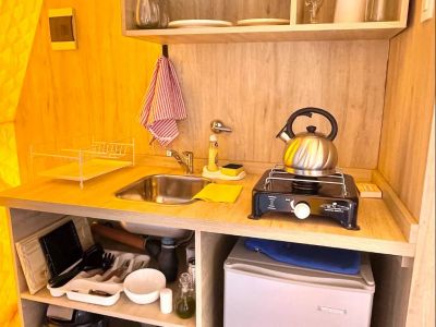 Cada domo cuenta con una cama matrimonial, cocina equipada, baño privado con agua caliente las 24?hs y ropa de cama con frazadas extra. Además, el complejo dispone de una zona de fuegos compartida con parrilla, disco, plancheta y horno de barro, ideal para encuentros al aire libre.