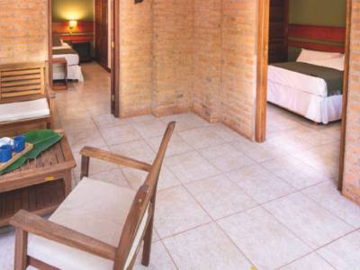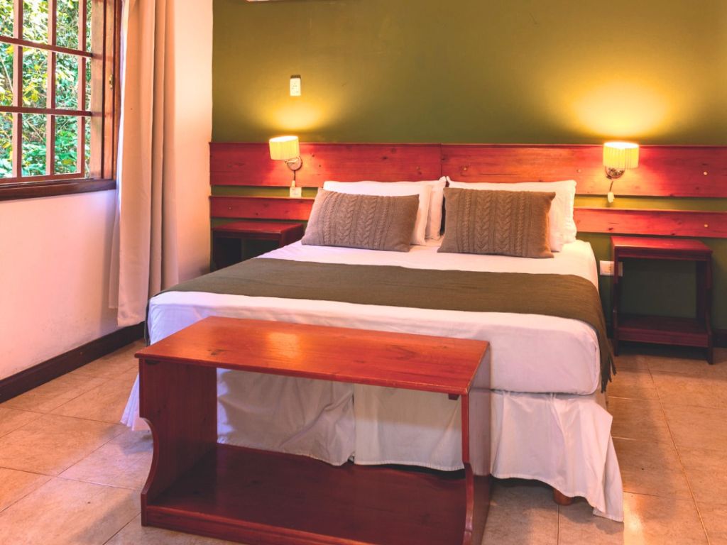 El complejo ofrece habitaciones y cabañas amplias, pensadas para familias, parejas o grupos de amigos. Cada unidad está equipada con aire acondicionado, baño privado, ropa de cama, toallas, TV y vista al jardín, generando un entorno cálido y acogedor para el descanso. Para quienes llegan en vehículo, el predio cuenta con estacionamiento amplio y seguro.