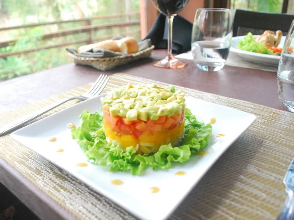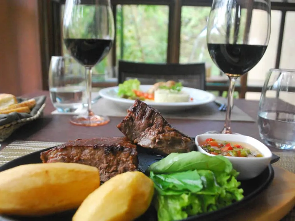 Para los amantes de la gastronomía, el restaurante de El Pueblito Iguazú es un punto fuerte. Su carta se nutre de productos locales y recetas tradicionales de las colonias inmigrantes de Misiones, con platos que incluyen carnes, pastas, pescados de río y postres caseros, todo servido en un ambiente cálido con capacidad para 60 comensales.