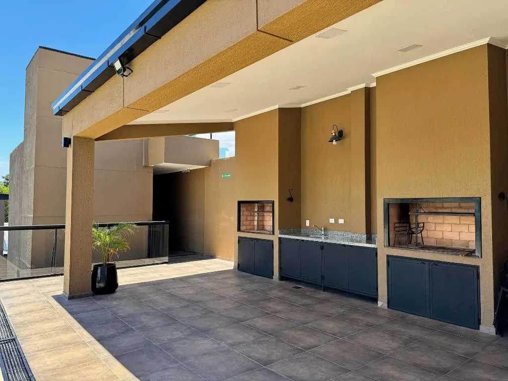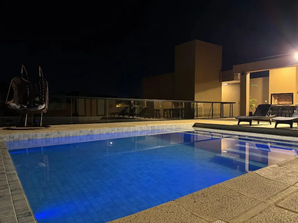 Uno de los espacios destacados del complejo es la piscina en altura, ubicada en el último piso. El área cuenta con reposeras, zonas de descanso y vistas abiertas hacia la naturaleza que rodea Puerto Iguazú. Por las noches, la iluminación cálida del sector invita a relajarse al aire libre. Contiguo a la piscina, el quincho equipado con parrillas, mesas amplias y mesadas está disponible para reuniones y comidas en grupo.