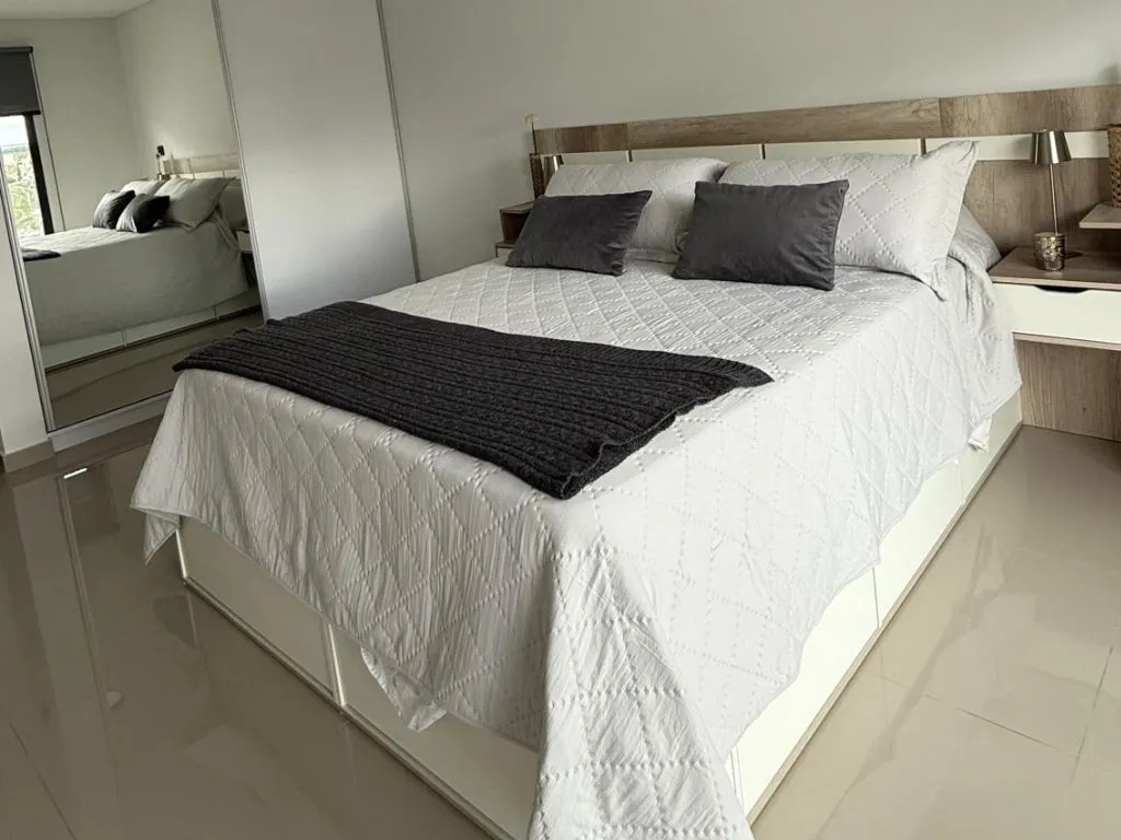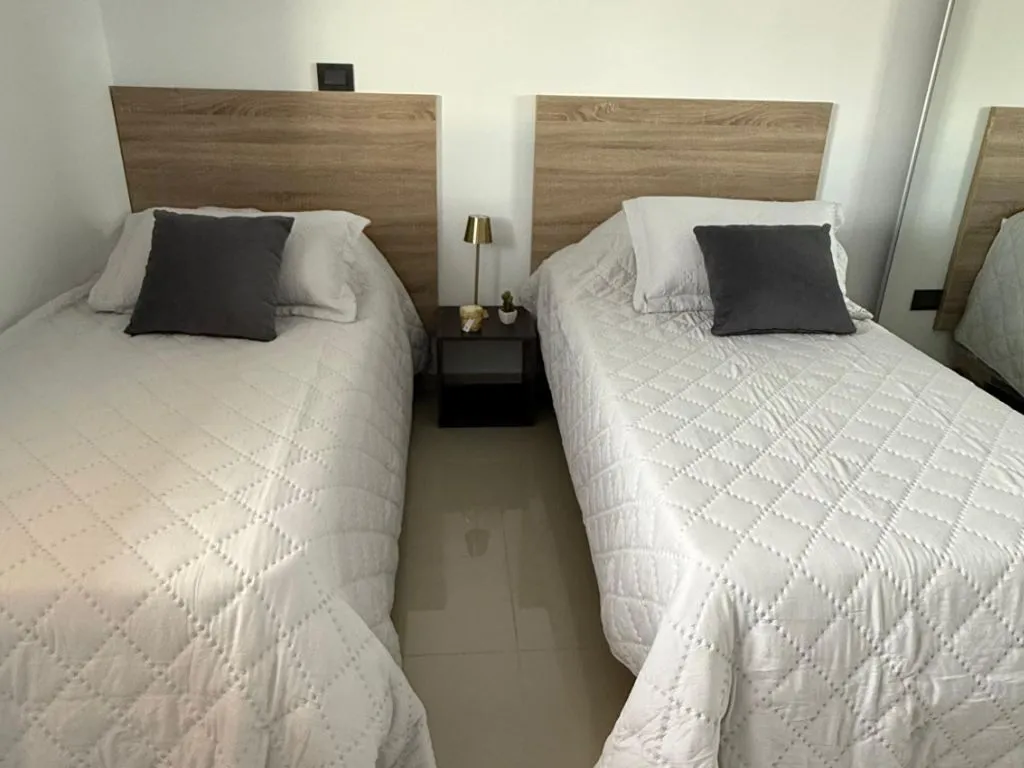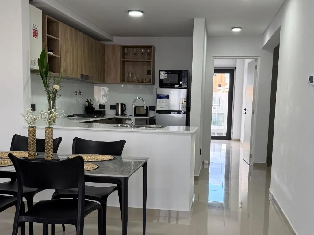 El departamento cuenta con dos habitaciones bien equipadas y un baño completo. Su cocina totalmente equipada permite a los huéspedes preparar sus propias comidas con total autonomía, haciendo de la estadía una experiencia cómoda y práctica. El edificio dispone de ascensor y acceso a gimnasio, sumando valor a la propuesta de alojamiento.
