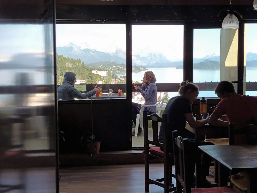 El hostel ocupa el último piso (décimo) de un edificio , por eso las habitaciones, el living y el balcón, tienen hermosas vistas al lago, estando en pleno centro de la ciudad.