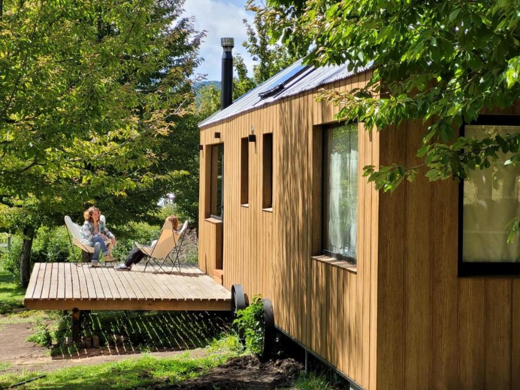 El deck de madera es otro de los grandes atractivos, con sillones BKF, una mesa con sillas y un fogón parrilla, pensado para disfrutar del aire libre. El desayuno artesanal, incluido en la estadía, deleita con productos orgánicos como granola, pan de masa madre, huevos de campo y miel local.