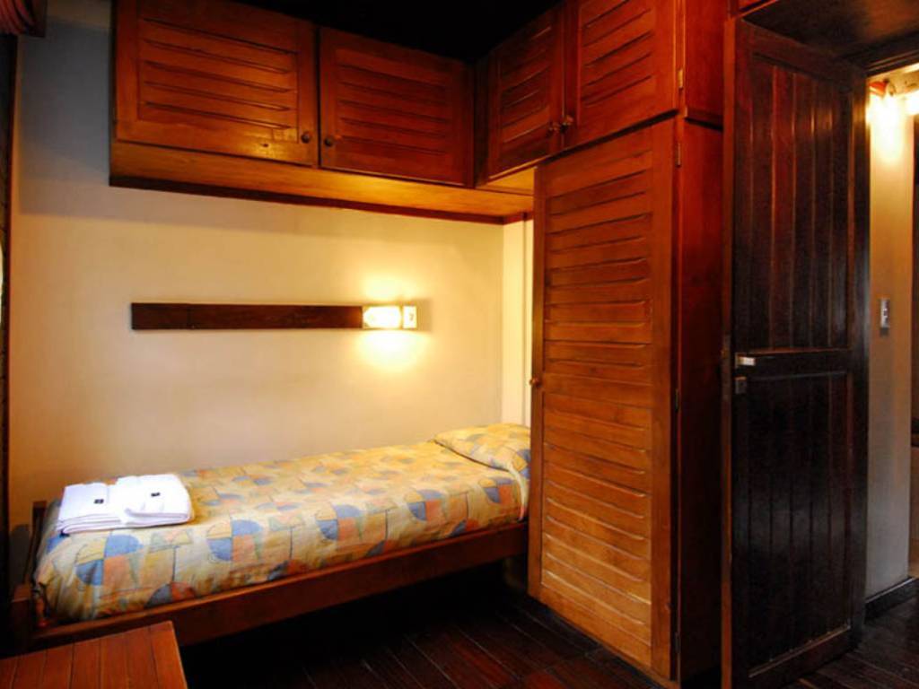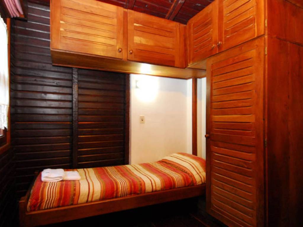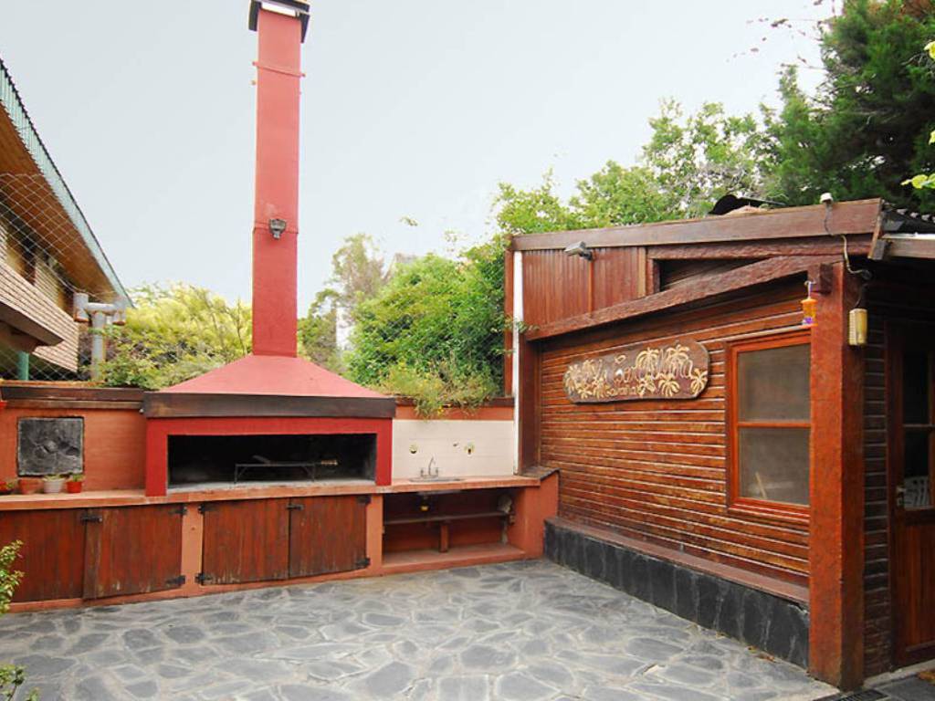 En la planta alta, el dormitorio matrimonial presenta cama doble, mesas de luz, ropero, espejo y valijero. El baño principal incluye bañera, ducha, bidet y toilette. Un segundo dormitorio ofrece dos camas cuchetas o marineras y una cama individual, además de ropero y valijero, ideal para grupos o familias.