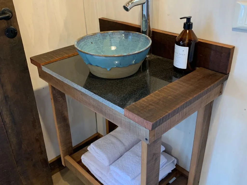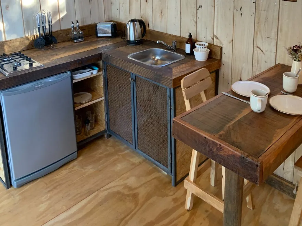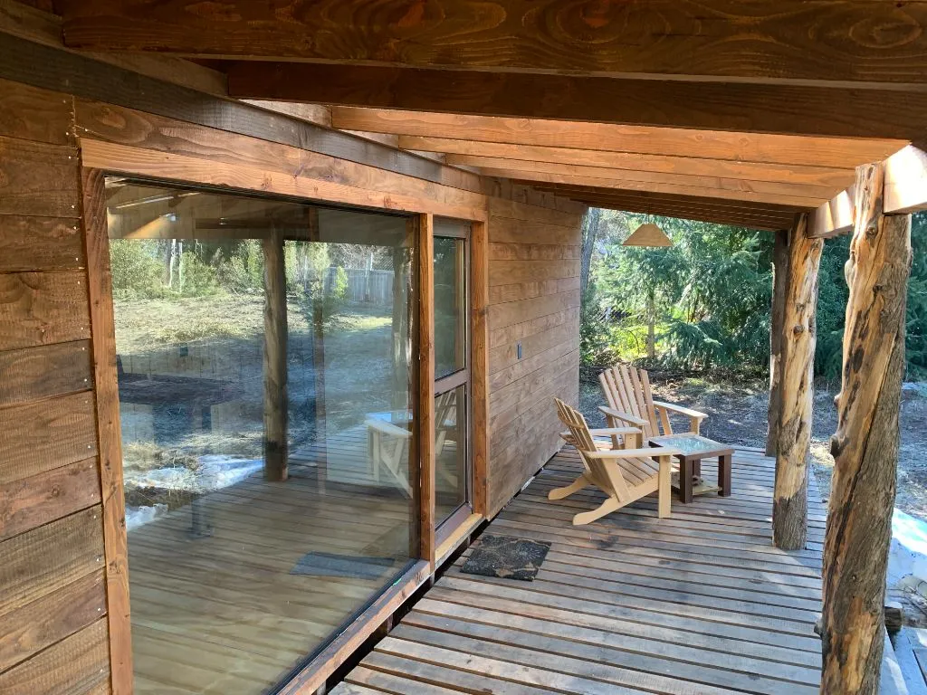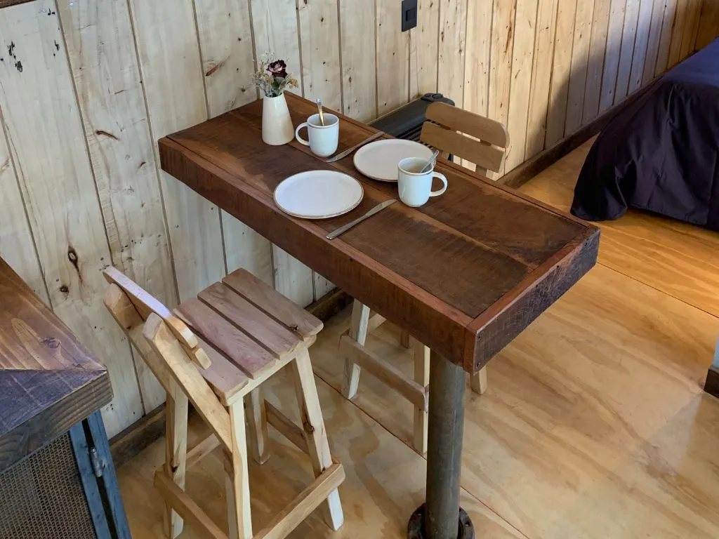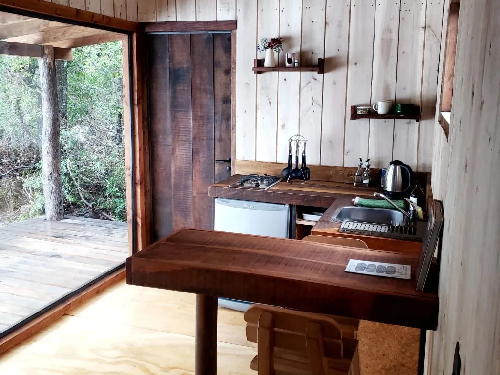 El interior de la cabaña, diseñado con esmero, fusiona elementos rústicos con toques modernos. La cálida luz que atraviesa las ventanas ilumina espacios acogedores, ideales para relajarse y disfrutar en buena compañía, proporcionando un ambiente confortable durante las noches más frías. La cocina, completamente equipada, permite preparar sabrosas comidas con productos locales.