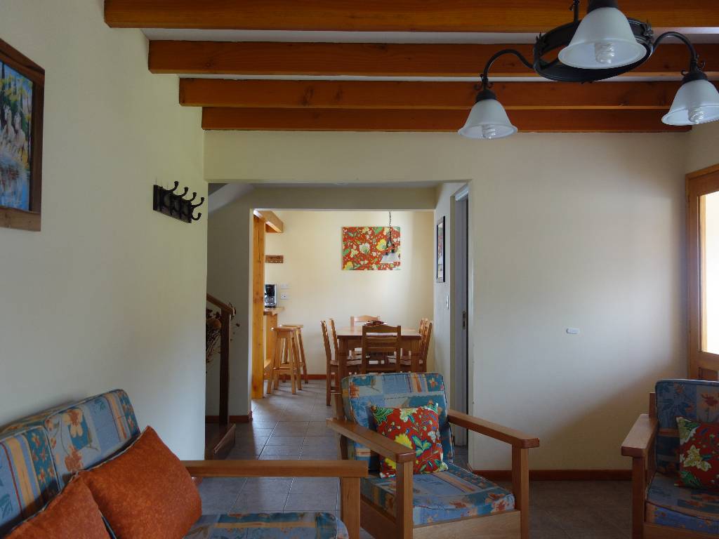 Cabaña para 5/6 Personas ,distribuidas en dos plantas: La planta baja dispone de la cocina totalmente equipada con desayunador, living con hogar a leña y un sofa cama.