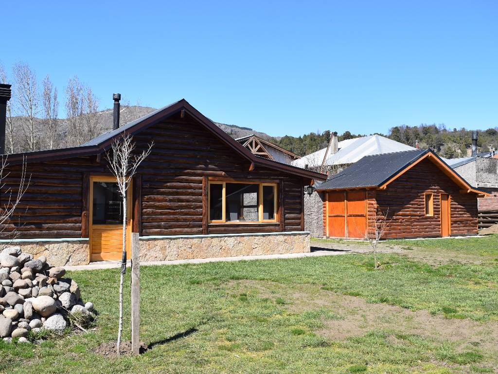 Cabaña para 4/5 personas, distribuidas en dos plantas: en la planta baja cocina totalmente equipada, comedor, living con sofá cama y hogar a leña.
