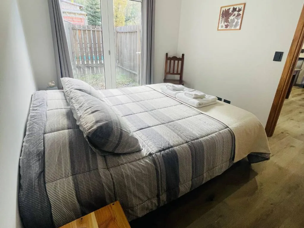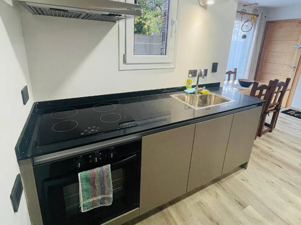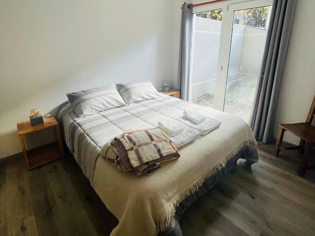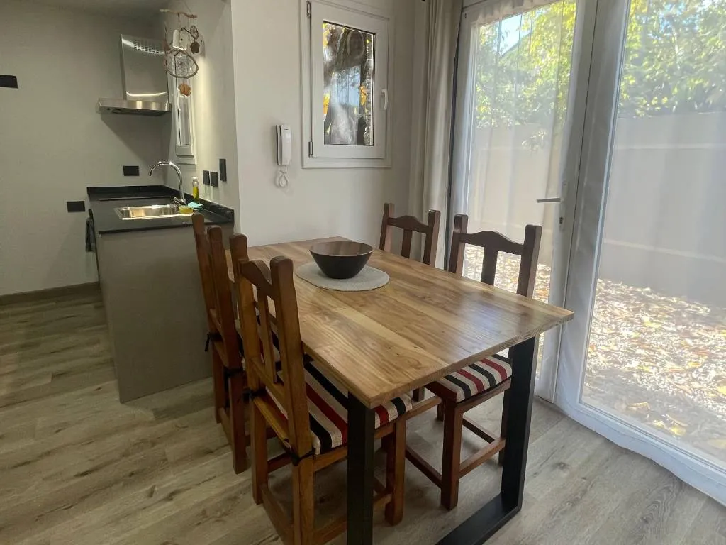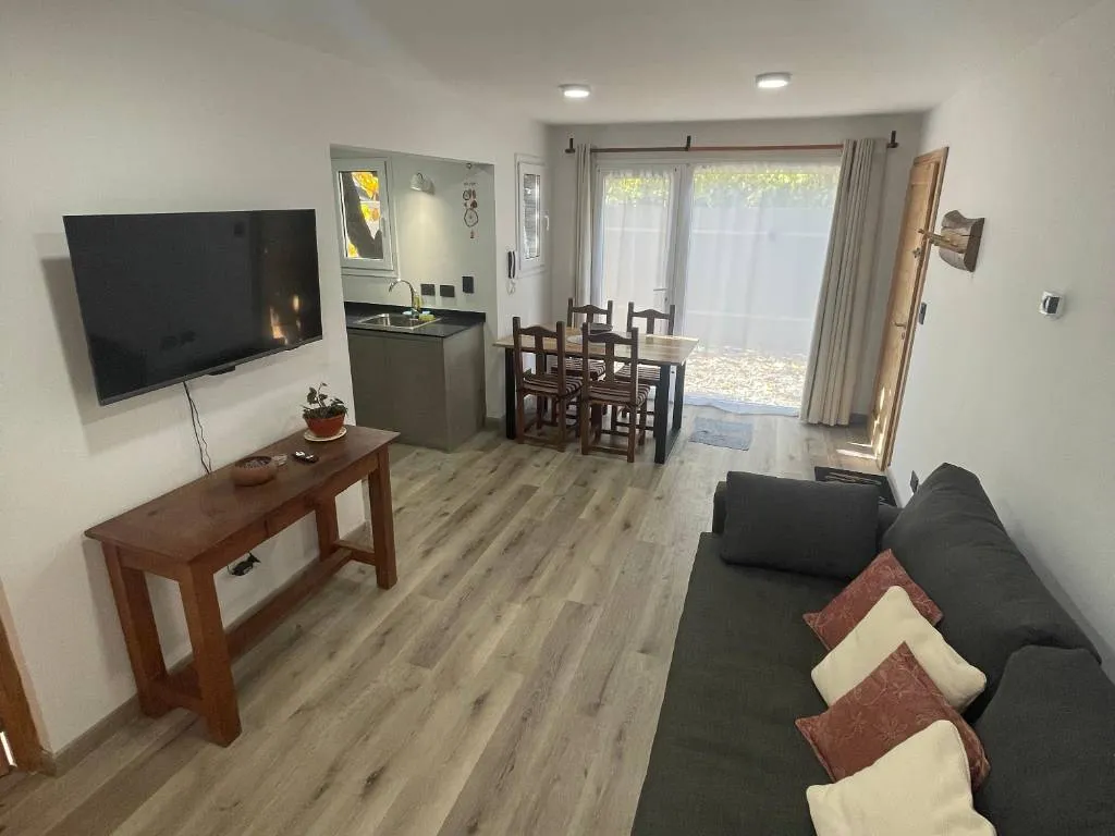 Cuenta con un dormitorio con cama matrimonial queen y acceso a un patio privado. Living-comedor muy amplio con un sillón con carro cama para dos personas y amplio espacio para desayunar o cenar. La cocina está totalmente equipada con horno, cocina eléctrica de inducción, microondas, tostadora, pava eléctrica, cafetera y vajilla completa.