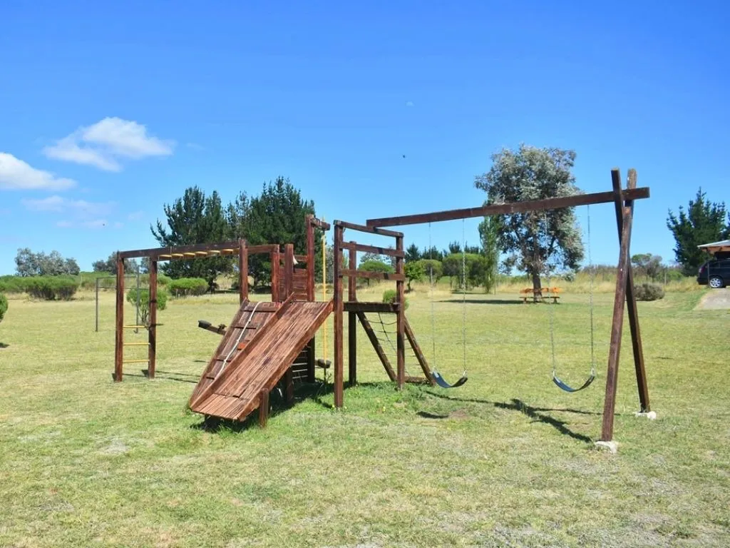 The fenced outdoor swimming pool with solarium, sun loungers, and umbrellas is one of the highlights of the complex, complemented by a children’s playground and green open spaces. Its strategic location allows easy access to attractions such as Parque Independencia, Monte Calvario, and Lago del Fuerte, positioning these cabins in Tandil as a well-rounded option for vacationsweekend getaways.