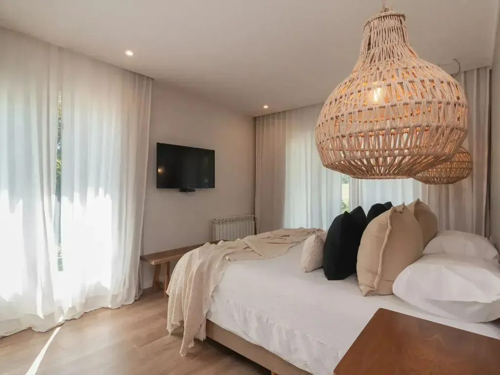 The double rooms are located in the main building and are designed for two guests. They feature a double bed, LED TV with HD channels, small refrigerator, electric kettle, safety deposit box, hot and cold air conditioning, bathroom amenities, hair dryer, and complimentary coffee and tea. The stay includes breakfast, access to the outdoor swimming pool, gym, parking, Wi-Fi in common areas and access to the spa.