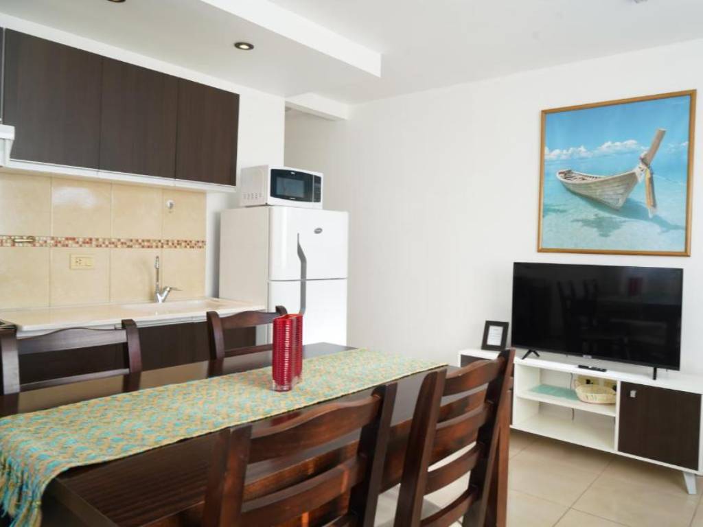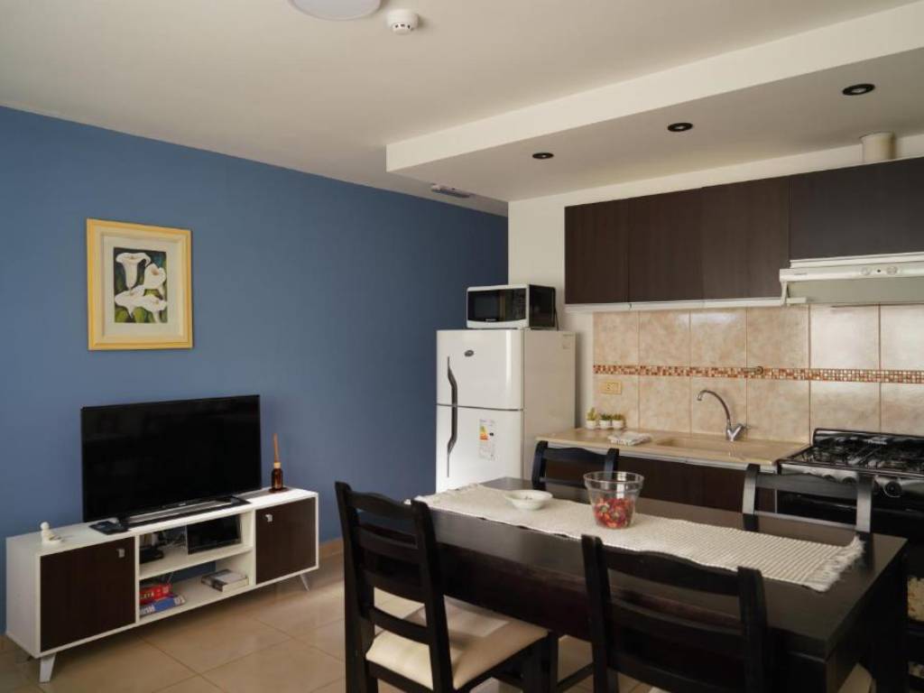 It has 1 room, has 2 single beds and a sofa bed. It is equipped with cable TV, WiFi, refrigerator with freezer, microwave, toaster, electric kettle, stove, oven, and all the basic cooking utensils.