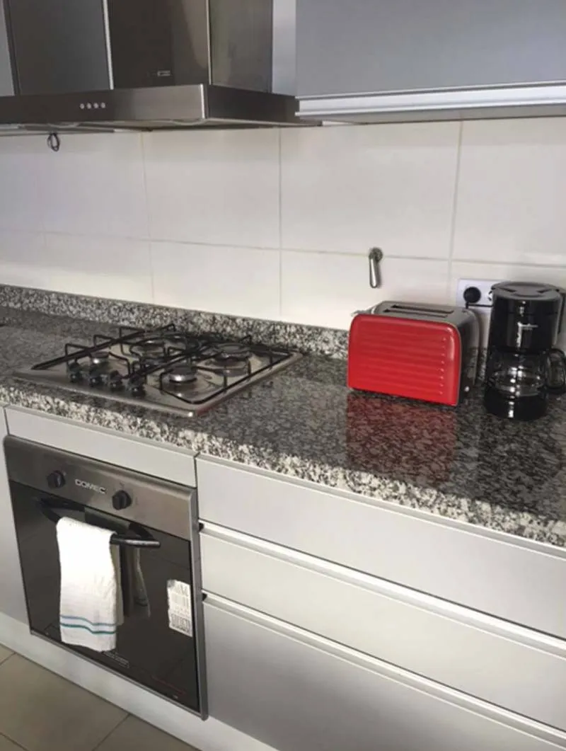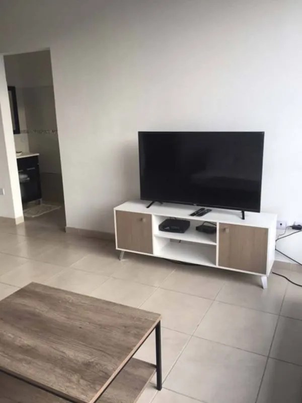 El estar se encuentra equipado con TV color con cable (smart- 40 pulgadas) dos sillones, cocina (vajilla completa) y comedor.