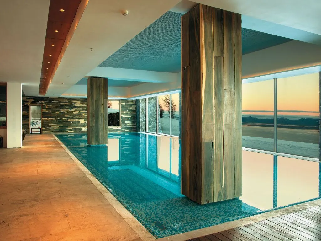 El área de resort y spa es uno de los puntos más completos del establecimiento. Cuenta con más de 300 m² de espejos de agua proveniente de lluvias y deshielo, calefaccionada y tratada, que incluyen piscinas interiores y exteriores, hot tubs, jets de agua, piscina para niños y deportes acuáticos. El spa ofrece una carta de tratamientos y vistas panorámicas sobre Ushuaia. El gimnasio está equipado con máquinas Technogym de última generación.