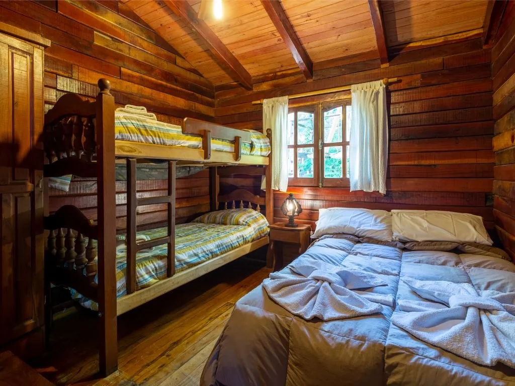 • 2-bedroom cabins: capacity up to 4 people, master bedroom with double bed, another with bunk beds, spacious kitchen-dining room, full bathroom, gallery with barbecue grill, and individual covered parking.