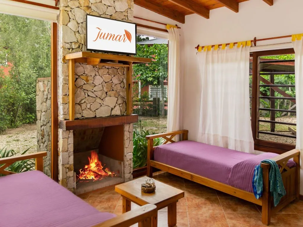 • Cabaña Maíz – Ground floor, 2 sofa beds, 32" LED TV, wood-burning fireplace, ceiling fans, and eco-friendly heating.