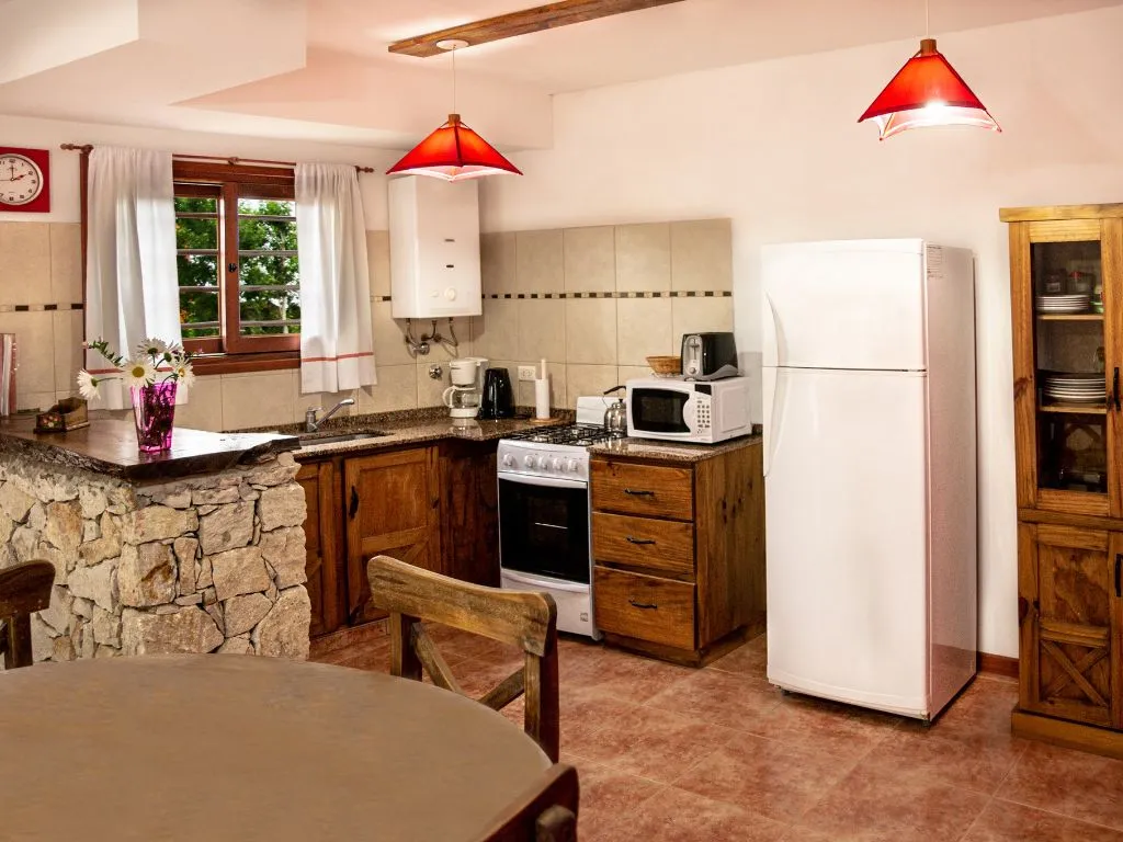 • Cabaña Verde – Ground floor, fully equipped kitchen with oven, microwave, coffee maker, fridge with freezer, table and chairs for 6.