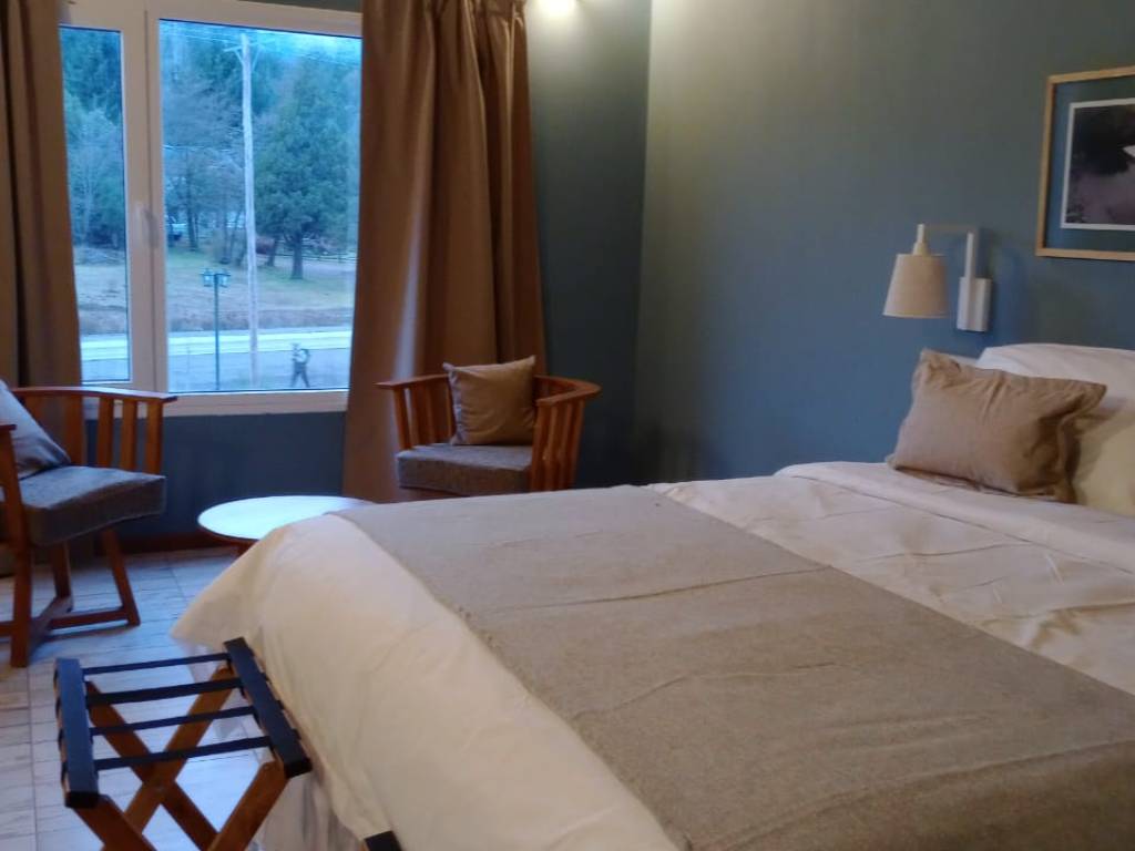 Sus habitaciones, cuidadosamente diseñadas, ofrecen un ambiente cálido y acogedor, equipadas con todas las comodidades necesarias para una estancia placentera. Los amplios ventanales permiten disfrutar de vistas panorámicas al Cerro Bayo y a la exuberante vegetación circundante.